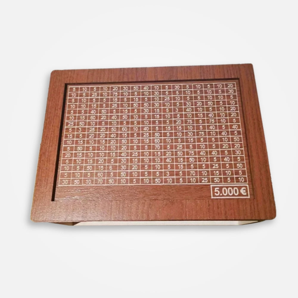 Cette tirelire en bois a été inspirée de la méthode japonaise Kakebo, "livre de compte ménager", une méthode efficace pour faire des économies. Sur le devant de cette tirelire se trouve un tableau avec des nombres, vous devrez cocher le nombre correspondant à la somme que vous venez d'ajouter dans votre boîte à argent en bois.