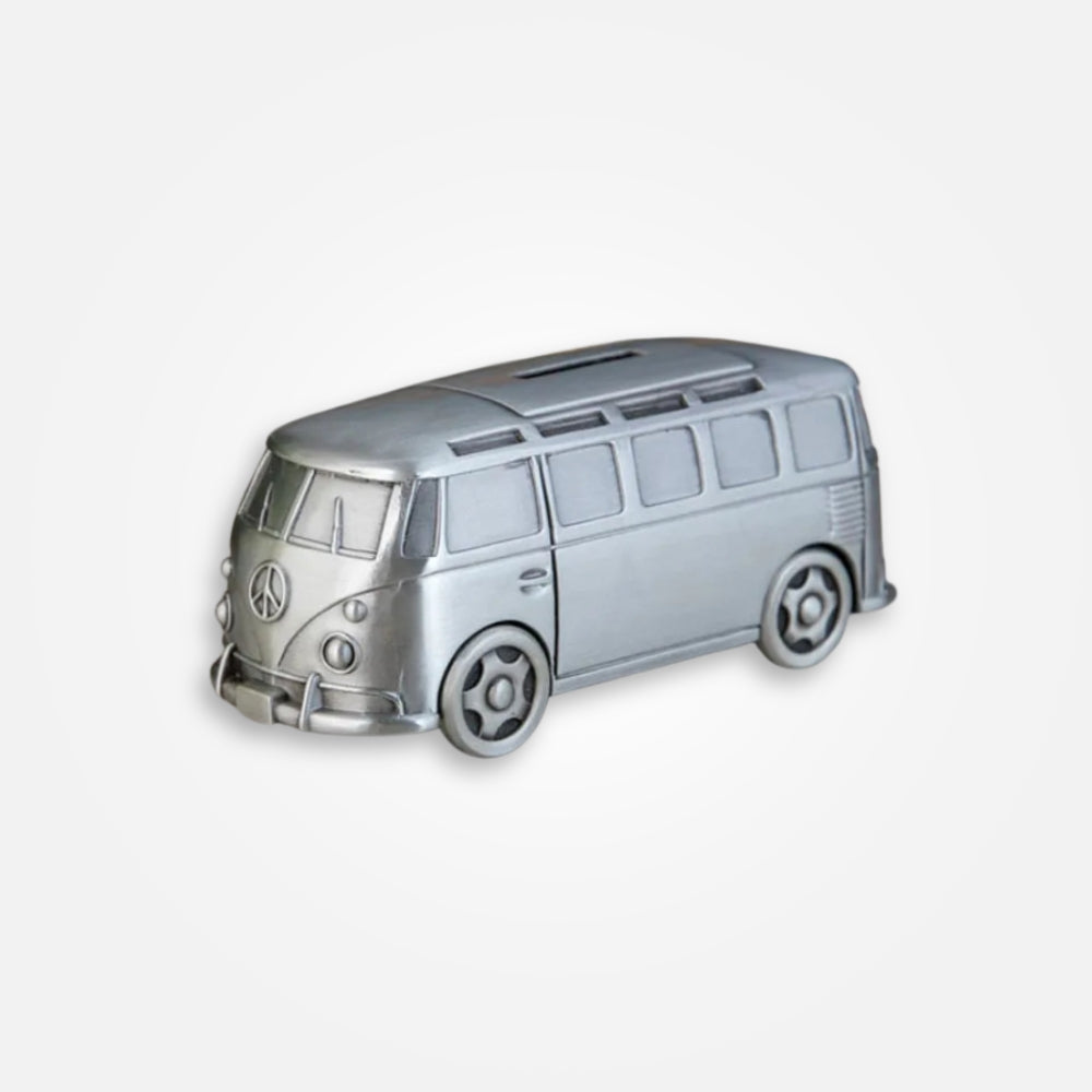 Fabriquée en métal argenté, la tirelire van allie solidité et esthétisme. Son design détaillé représentant un véritable van des années 80 en fait un véritable objet de collection pour les passionnés de véhicules emblématiques. Idéale pour déposer vos pièces et billets, cette tirelire van argentée rappelle l'esprit des voyages sans fin ainsi que des aventures sur la route.